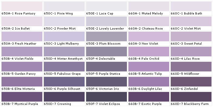 650A-1 Rose Fantasy 650C-1 Pixie Wing 650E-1 Lace Cap 660A-1 Muted Melody 660C-1 Bubble Bath 650A-2 Ice Ballet 650C-2 Powder Mist 650E-2 Lovely Lavender 660A-2 Chateau Rose 660C-2 Violet Mist 650A-3 Fresh Heather 650C-3 Light Mulberry 650E-3 Plum Blossom 660A-3 New Violet 660C-3 Sweet Petal 650B-4 Violet Fields 650D-4 Winter Amethyst 650F-4 Delectable 660B-4 Pale Orchid 660D-4 Lilac Rose 650B-5 Garden Pansy 650D-5 Fabulous Grape 650F-5 Purple Statice 660B-5 Atlantic Tulip 660D-5 Wildflower 650B-6 Elite Wisteria 650D-6 Purple Silhouet 650F-6 Victorian Iris 660B-6 Daylight Lilac 660D-6 Zinfandel 650B-7 Mystical Purple 650D-7 Crowning 650F-7 Violet Eclipse 660B-7 Exotic Purple 660D-7 Blackberry Farm